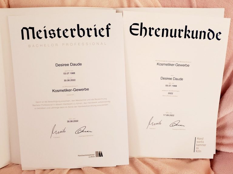 Im Jahr 2022 erreichte sie mit dem erfolgreichen Abschluss zur Kosmetikmeisterin einen bedeutenden Meilenstein.